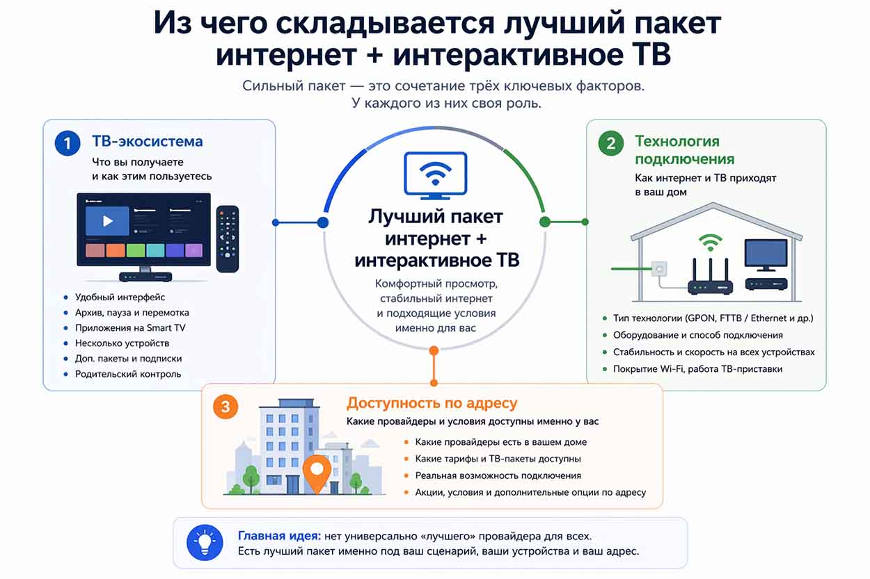 По-настоящему сильный пакет определяется сразу по трем слоям: ТВ-экосистема, технология подключения и адресная доступность. Один провайдер может быть особенно удобен по интерфейсу и интерактивным функциям, другой — по технологической базе и интернет-части пакета, а третий оказывается лучшим именно потому, что в вашем доме у него лучше фактическая инфраструктура. Поэтому сравнение стоит строить не как “топ провайдеров вообще”, а как прикладный выбор под конкретный сценарий семьи.